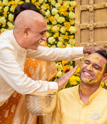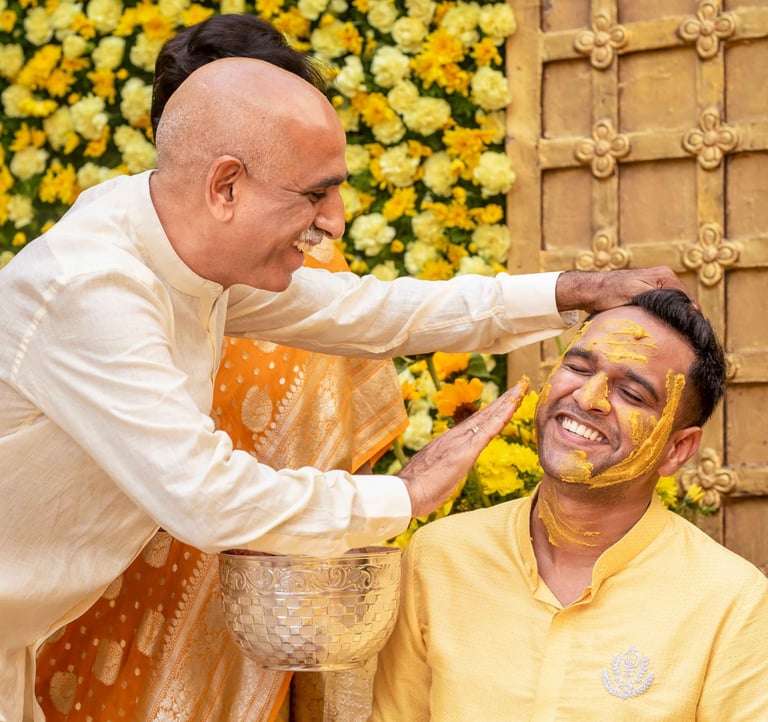 Family members apply a turmeric-based paste (haldi) to the bride and groom’s face, hands, and feet. This ritual is filled with laughter, music, and bright yellow outfits. The haldi is said to cleanse the body and ward off evil. Instead of separate events, both families can celebrate this together, encouraging playful interaction.