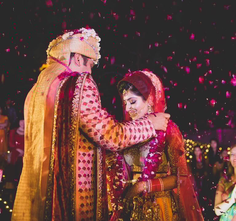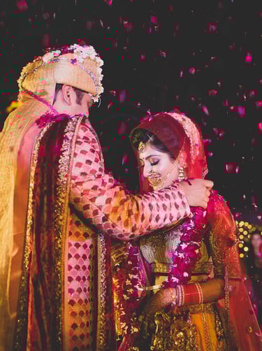 The bride and groom exchange floral garlands, symbolizing mutual respect and consent to the marriage. It’s usually playful and accompanied by cheering, music, and light-hearted teasing from friends.